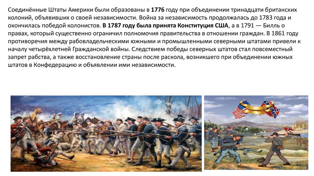 Соединённые Штаты Америки были образованы в 1776 году при объединении тринадцати британскихколоний, объявивших о своей независимости. Война за независимость продолжалась до 1783 года и