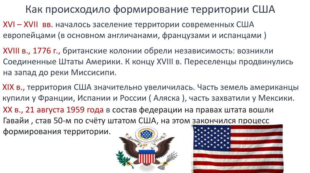 Как происходило формирование территории СШАXVI – XVII вв. началось заселение территории современных США