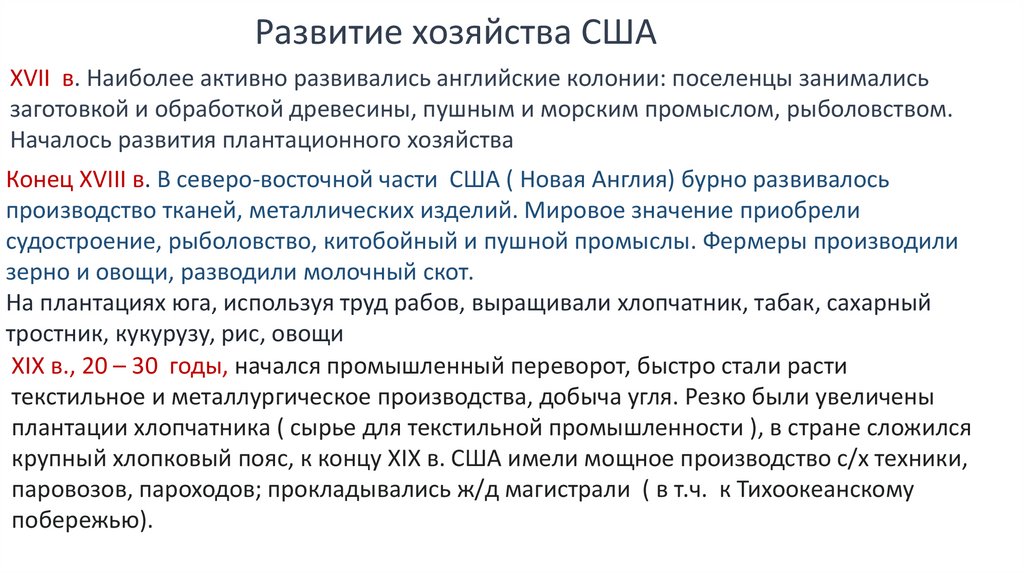 Развитие хозяйства СШАXVII в. Наиболее активно развивались английские колонии: поселенцы занимались