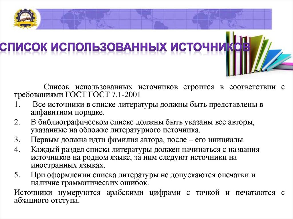 Список использованных источников строится в соответствии стребованиями ГОСТ ГОСТ 7.1-2001