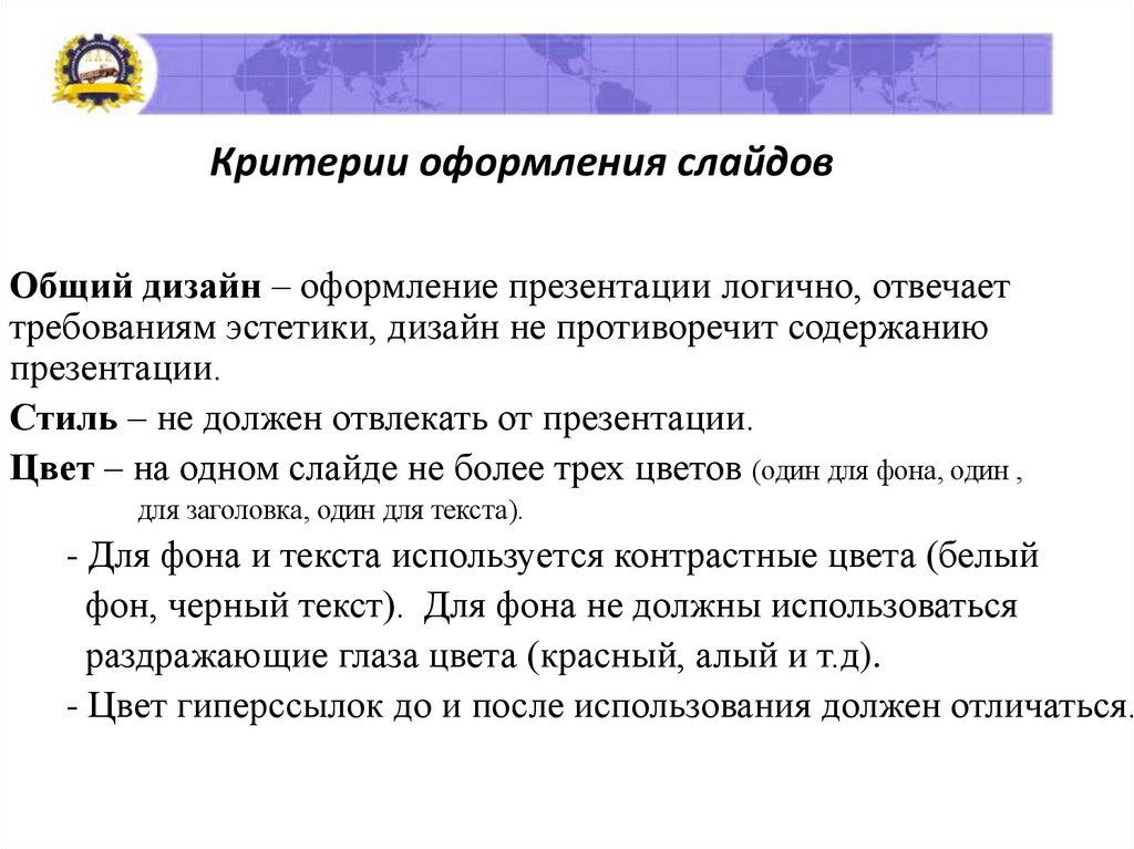 Критерии оформления слайдовОбщий дизайн – оформление презентации логично, отвечает