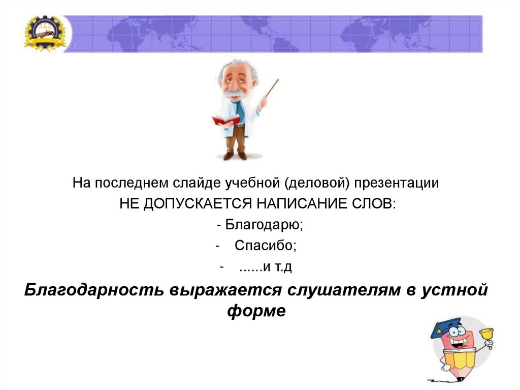 На последнем слайде учебной (деловой) презентацииНЕ ДОПУСКАЕТСЯ НАПИСАНИЕ СЛОВ: