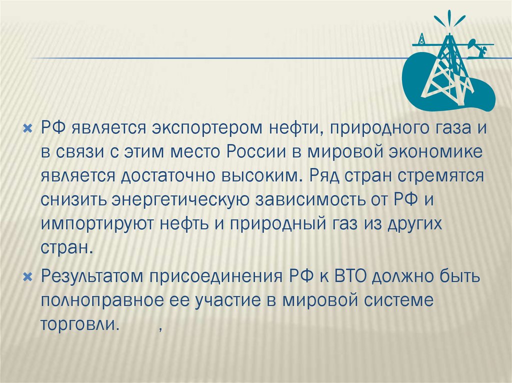 РФ является экспортером нефти, природного газа ив связи с этим место России в мировой экономике
