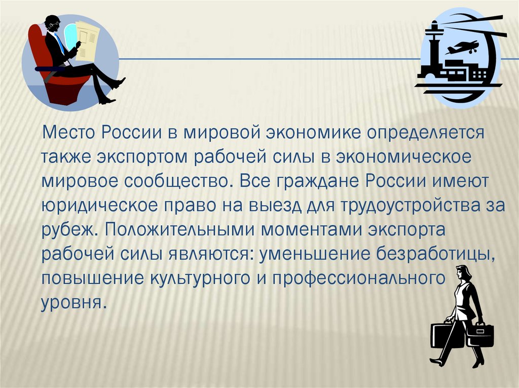 Место России в мировой экономике определяетсятакже экспортом рабочей силы в экономическое