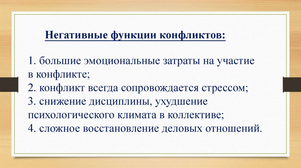 Негативные функции конфликтов:1. большие эмоциональные затраты на участие
