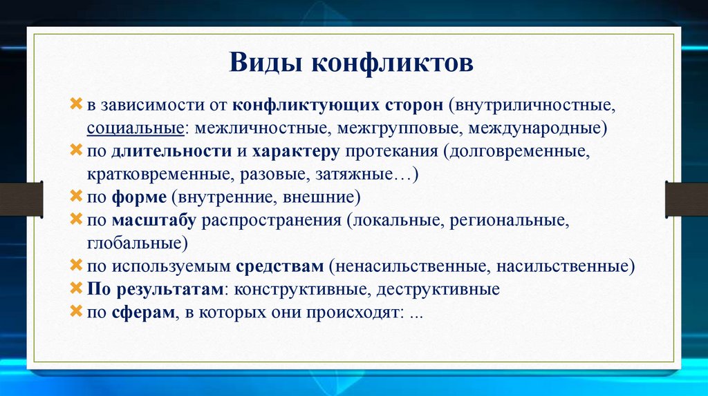 Виды конфликтовв зависимости от конфликтующих сторон (внутриличностные,