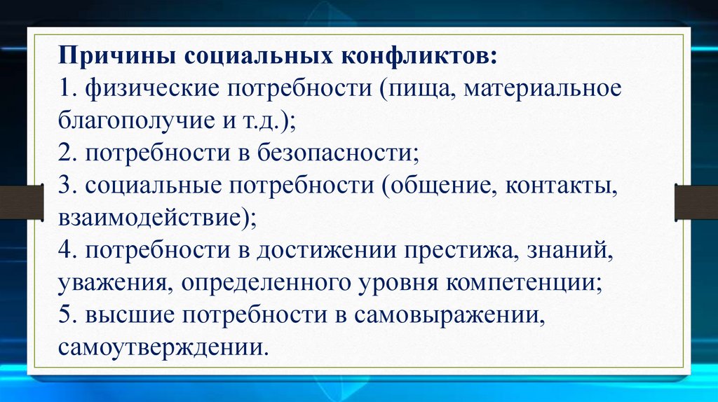 Причины социальных конфликтов:1. физические потребности (пища, материальное