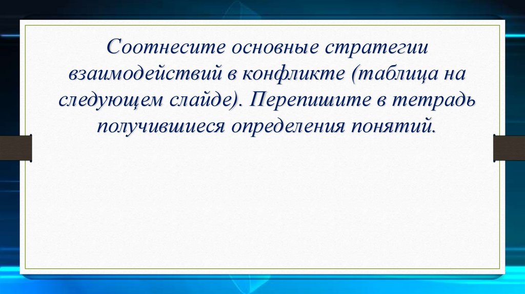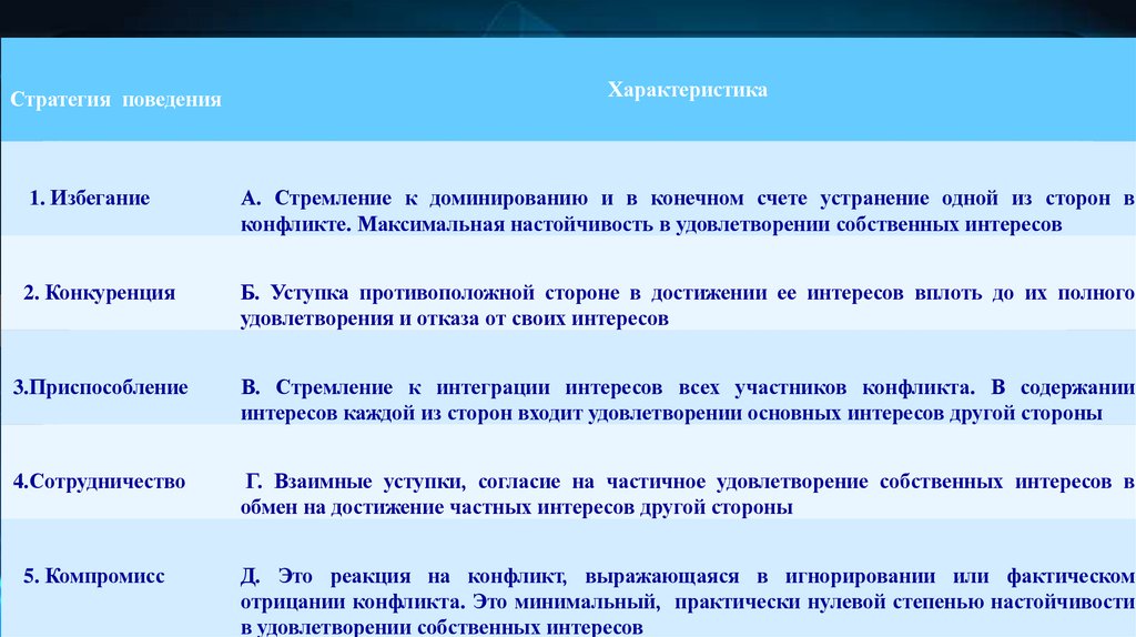 Соотнесите основные стратегиивзаимодействий в конфликте (таблица на