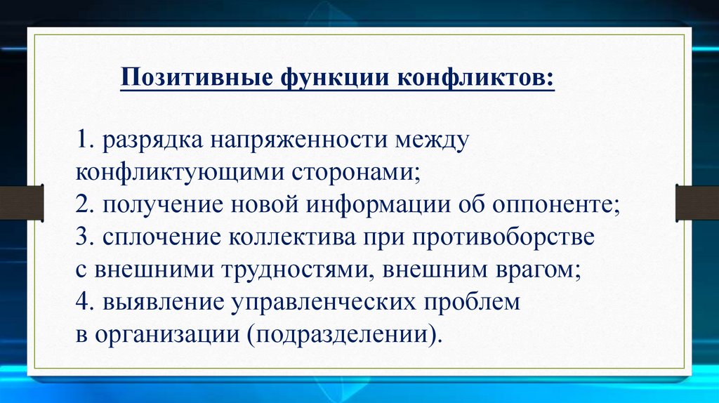 Позитивные функции конфликтов:1. разрядка напряженности между