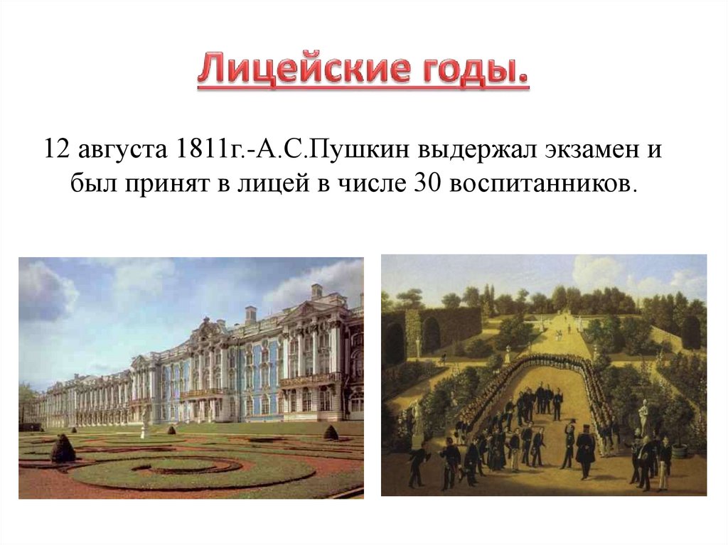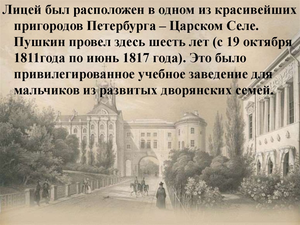 Лицей был расположен в одном из красивейшихпригородов Петербурга – Царском Селе.
