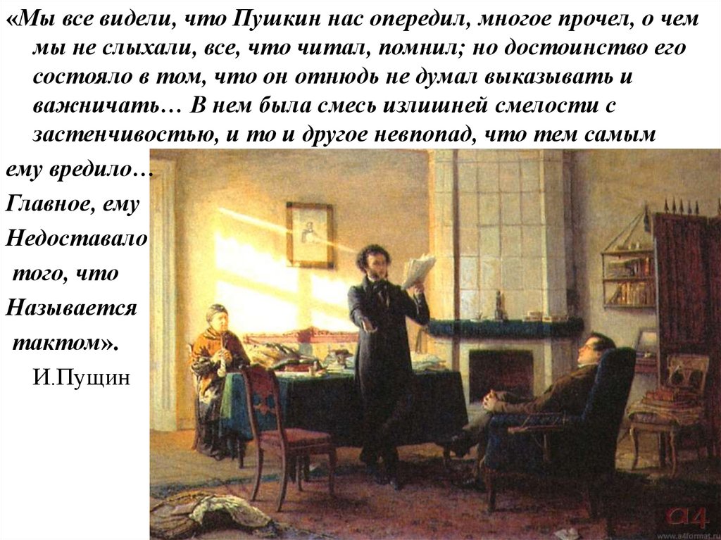 «Мы все видели, что Пушкин нас опередил, многое прочел, о чеммы не слыхали, все, что читал, помнил; но достоинство его