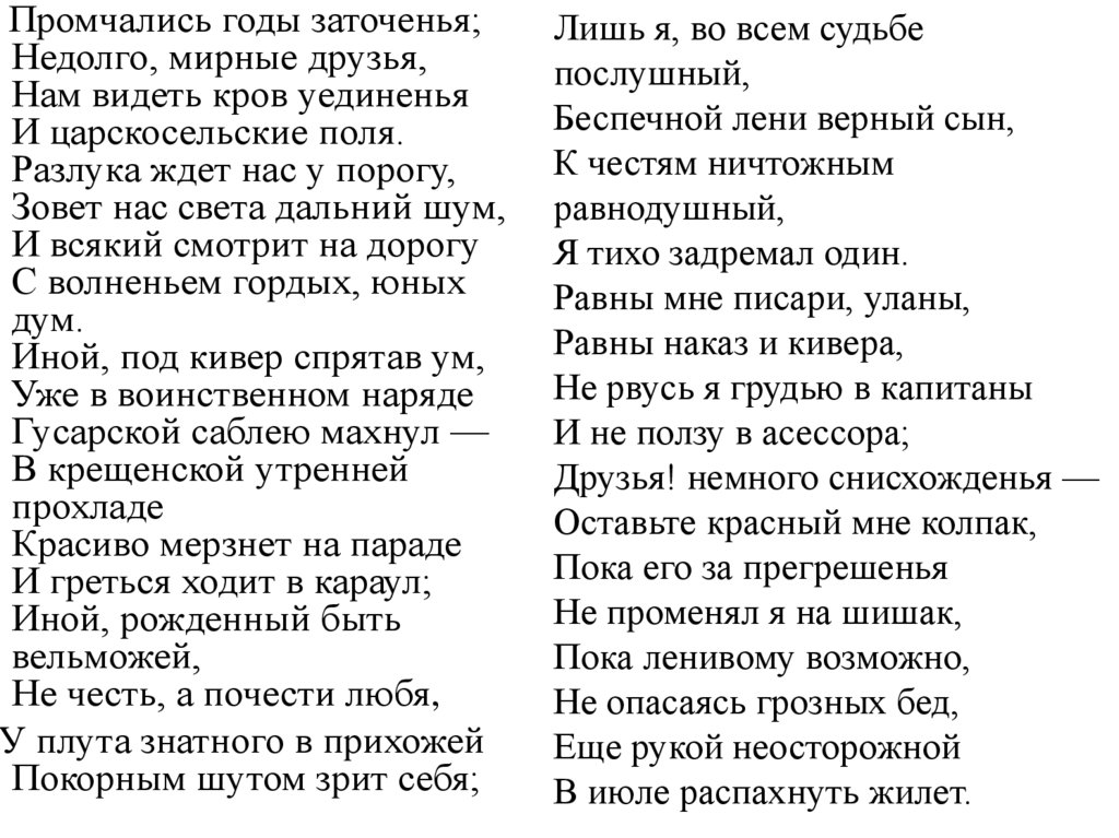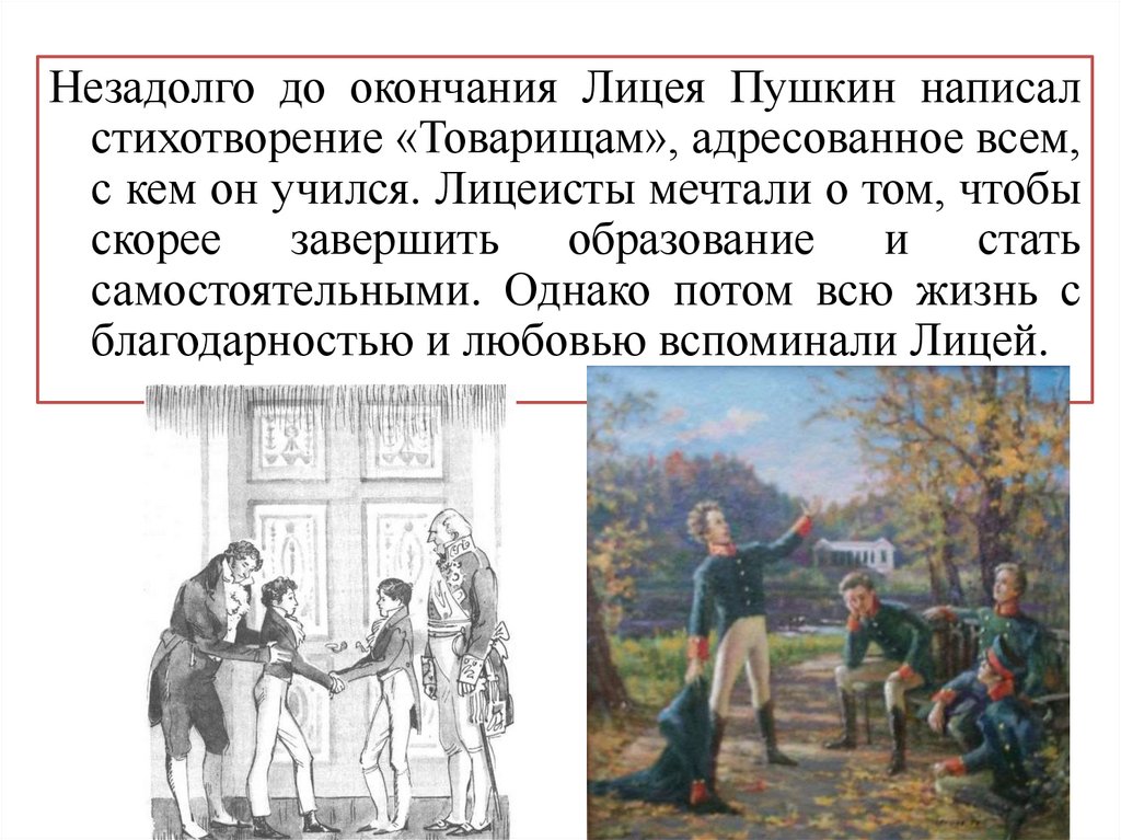 Незадолго до окончания Лицея Пушкин написалстихотворение «Товарищам», адресованное всем,