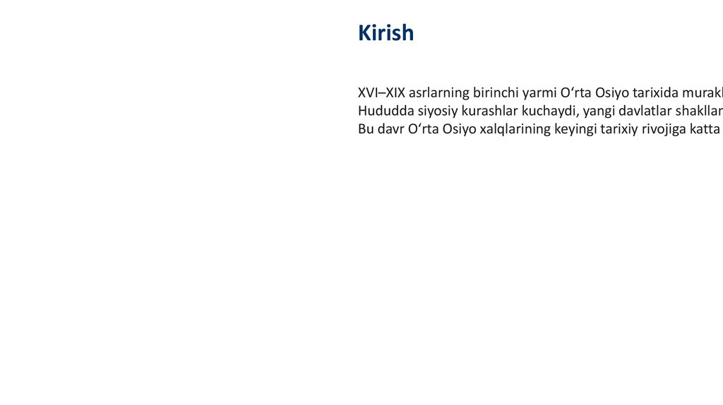 KirishXVI–XIX asrlarning birinchi yarmi O‘rta Osiyo tarixida murakk