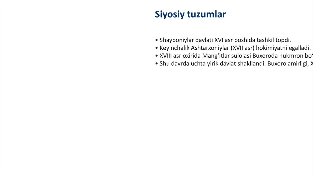 • Uchta yirik davlat shakllandi: Buxoro amirligi, Xiva xonligi, Q