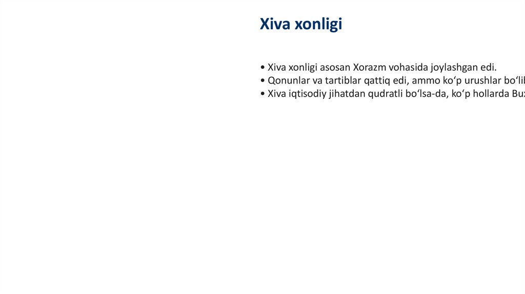 • Xiva iqtisodiy jihatdan qudratli bo‘lsa-da, ko‘p hollarda Bux