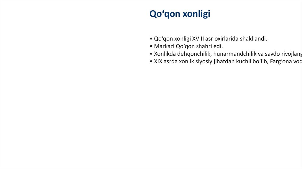 Qo‘qon xonligi• Qo‘qon xonligi XVIII asr oxirlarida shakllandi.