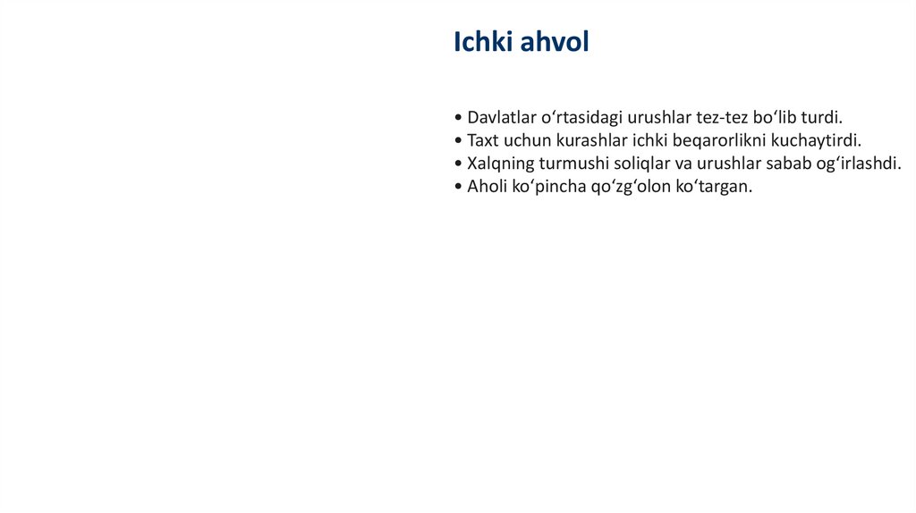 • Taxt uchun kurashlar ichki beqarorlikni kuchaytirdi.
