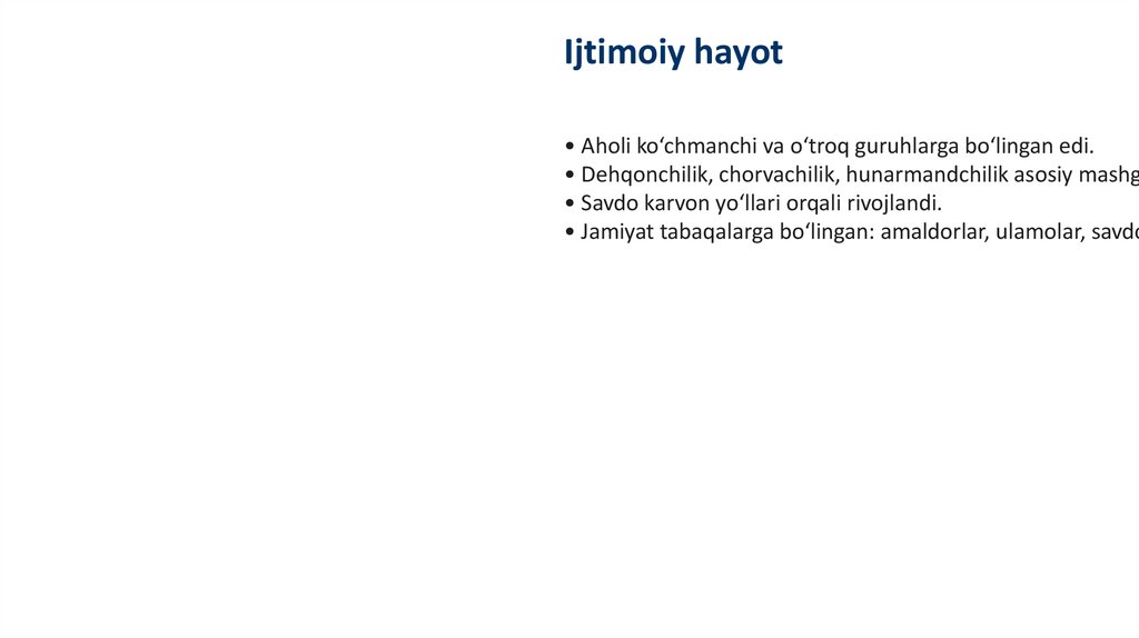 • Jamiyat tabaqalarga bo‘lingan: amaldorlar, ulamolar, savdo