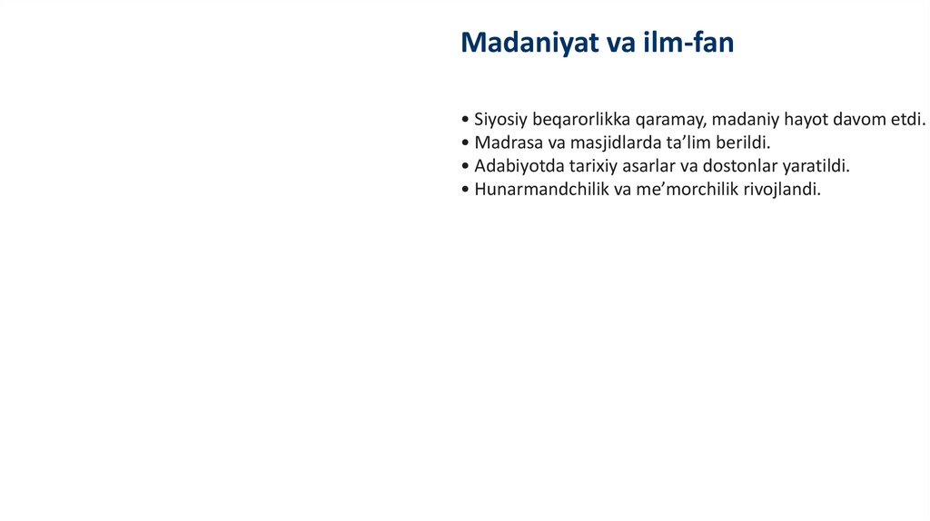 • Shu bilan birga, madaniyat, ilm-fan va savdo rivojlanishda d