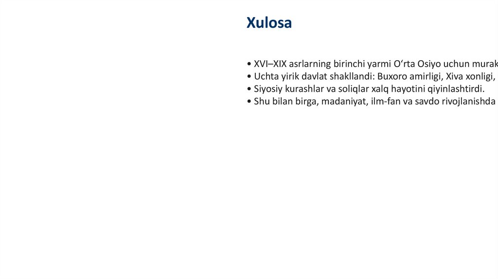 Xulosa• XVI–XIX asrlarning birinchi yarmi O‘rta Osiyo uchun murak