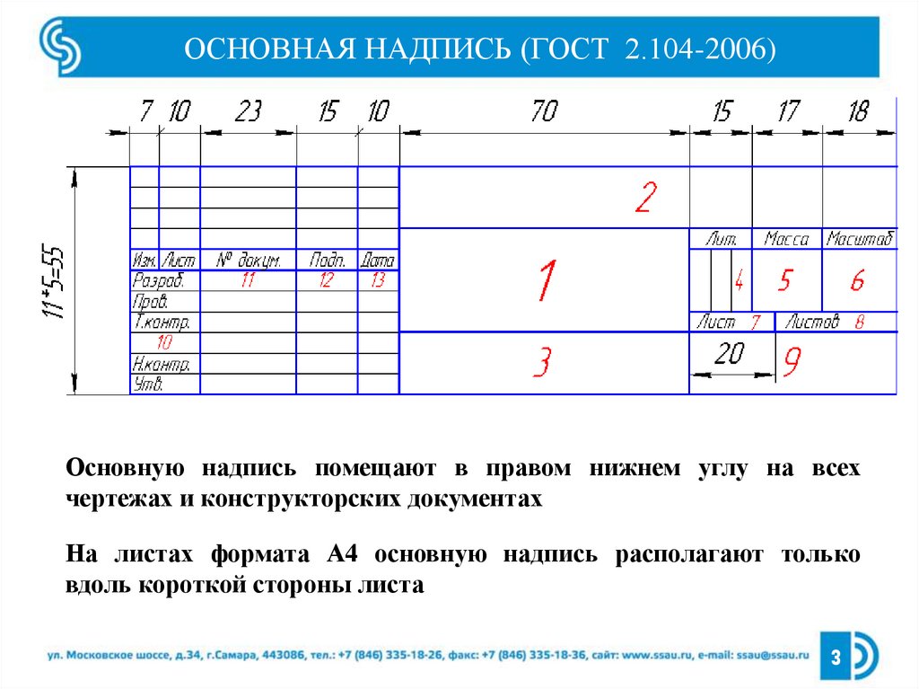 ОСНОВНАЯ НАДПИСЬ (ГОСТ 2.104-2006)Основную надпись помещают в правом нижнем углу на всех