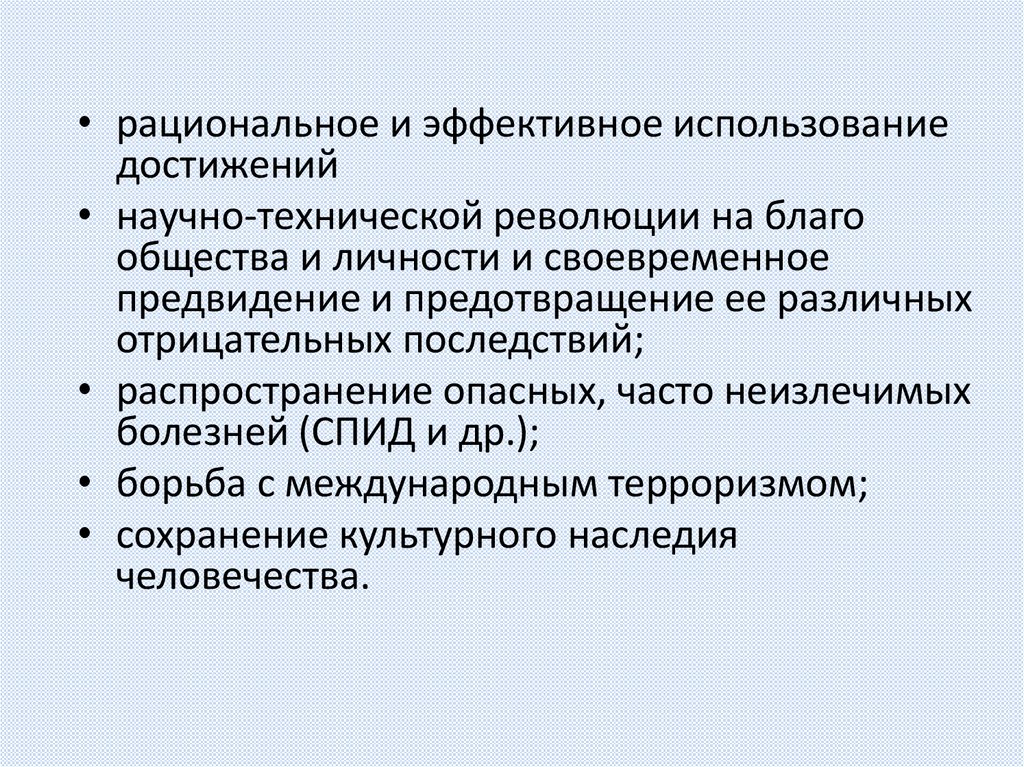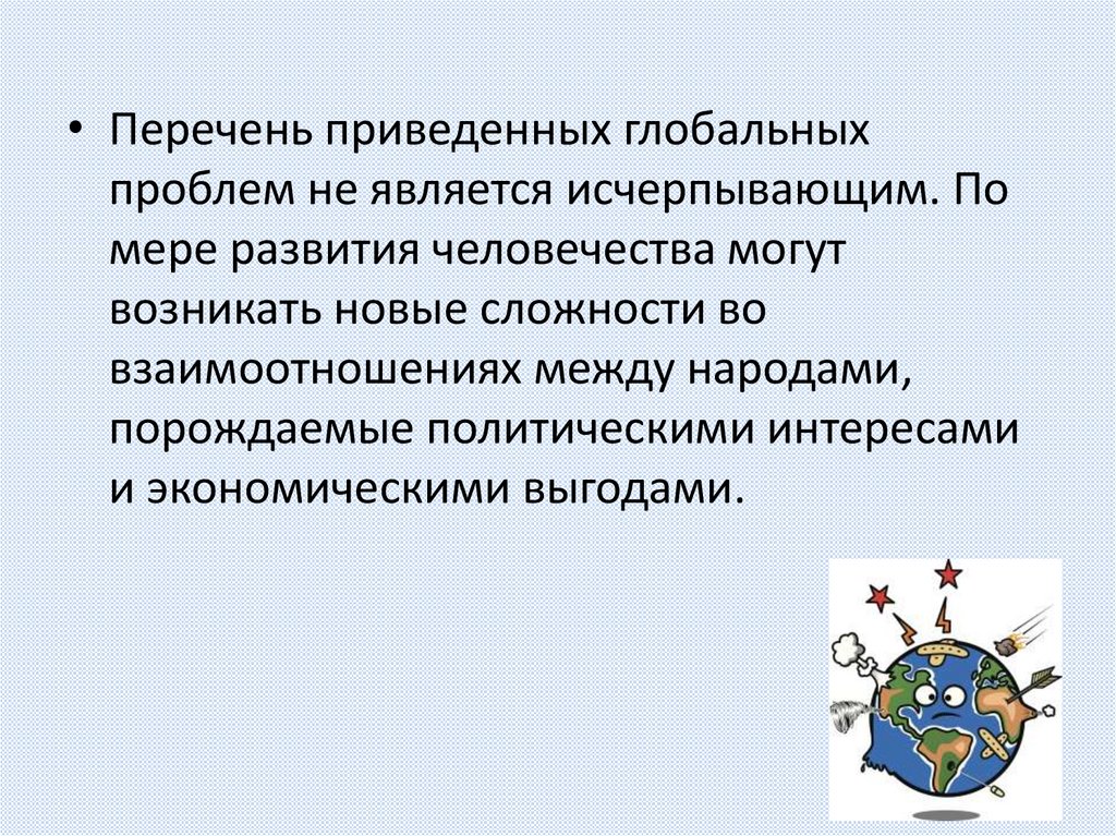 • Перечень приведенных глобальныхпроблем не является исчерпывающим. По