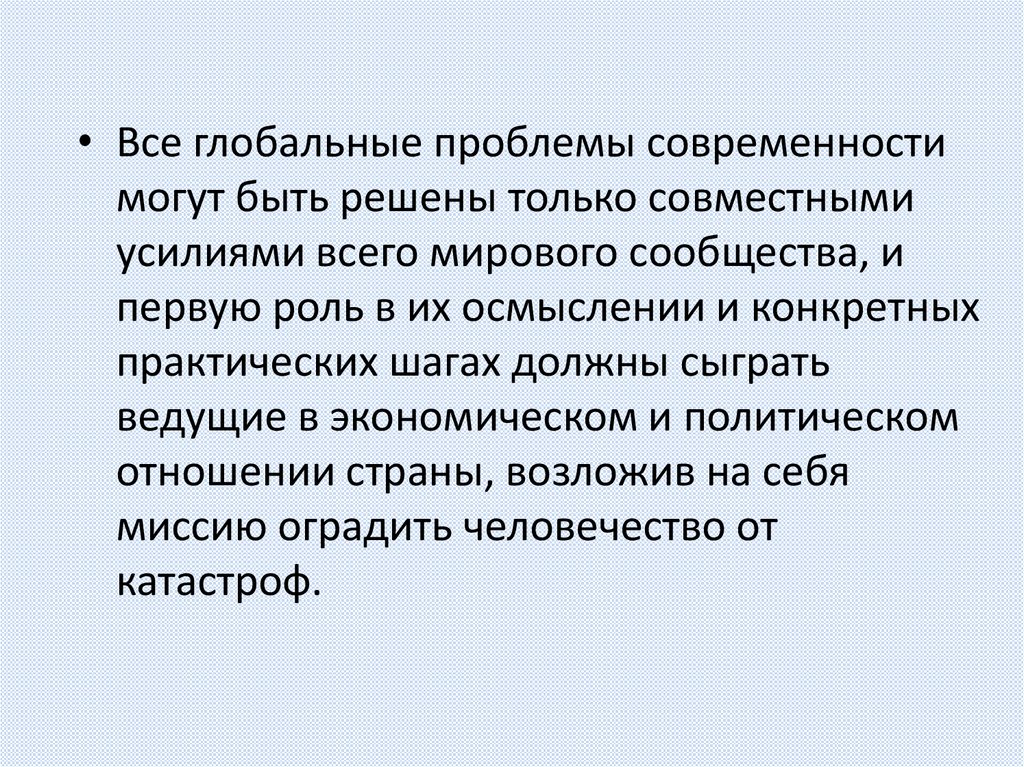 • Все глобальные проблемы современностимогут быть решены только совместными