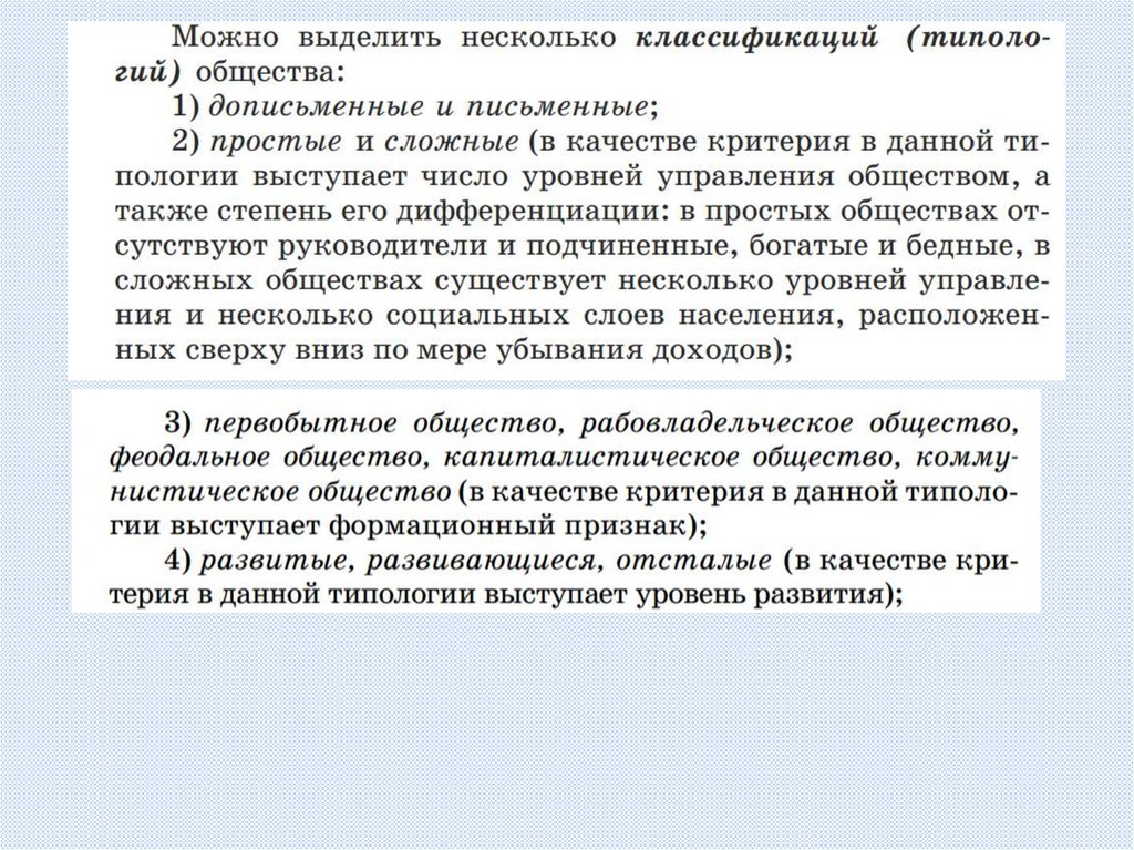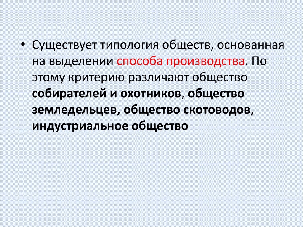 • Существует типология обществ, основаннаяна выделении способа производства. По