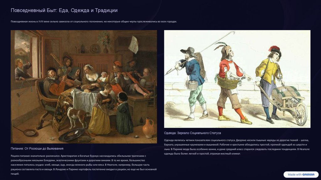 Повседневный Быт: Еда, Одежда и ТрадицииПовседневная жизнь в XVIII веке сильно зависела от социального положения, но некоторые общие черты прослеживались во всех городах.