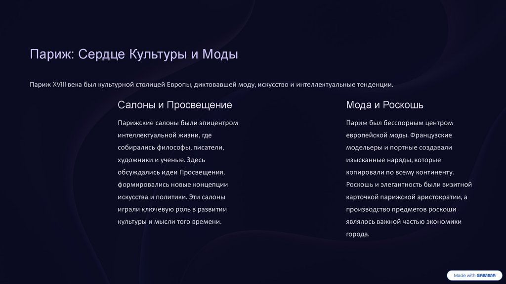 Париж: Сердце Культуры и МодыПариж XVIII века был культурной столицей Европы, диктовавшей моду, искусство и интеллектуальные тенденции.