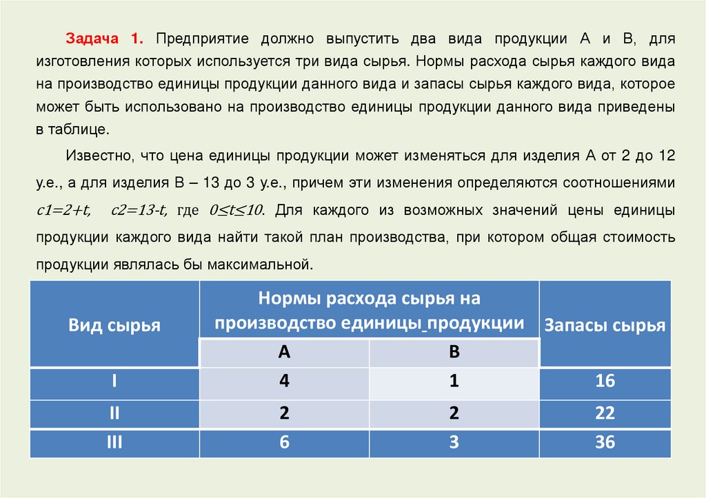 Задача 1. Предприятие должно выпустить два вида продукции А и В, дляизготовления которых используется три вида сырья. Нормы расхода сырья каждого вида