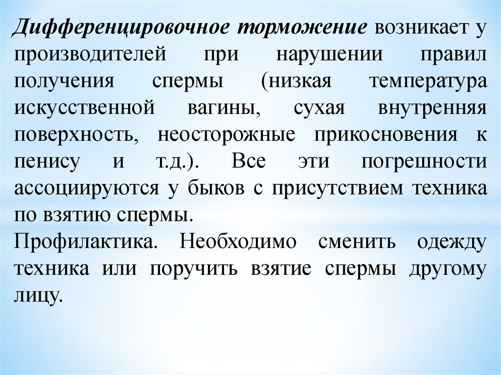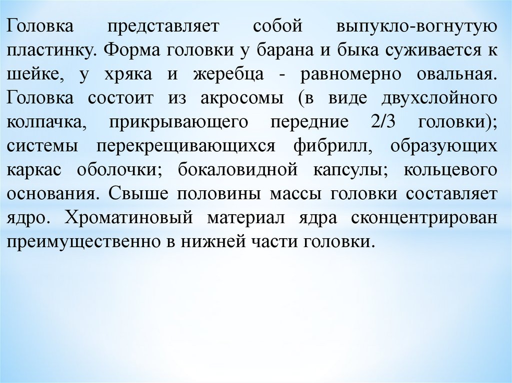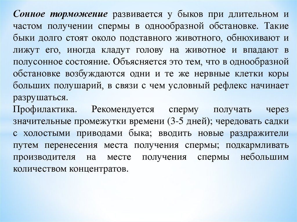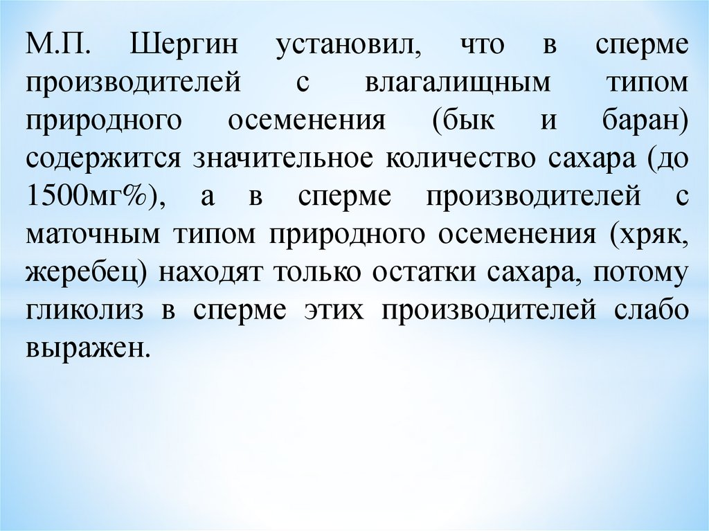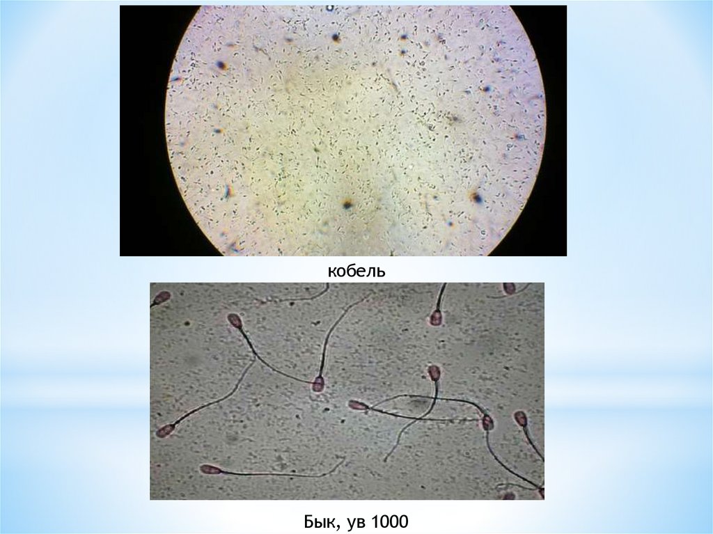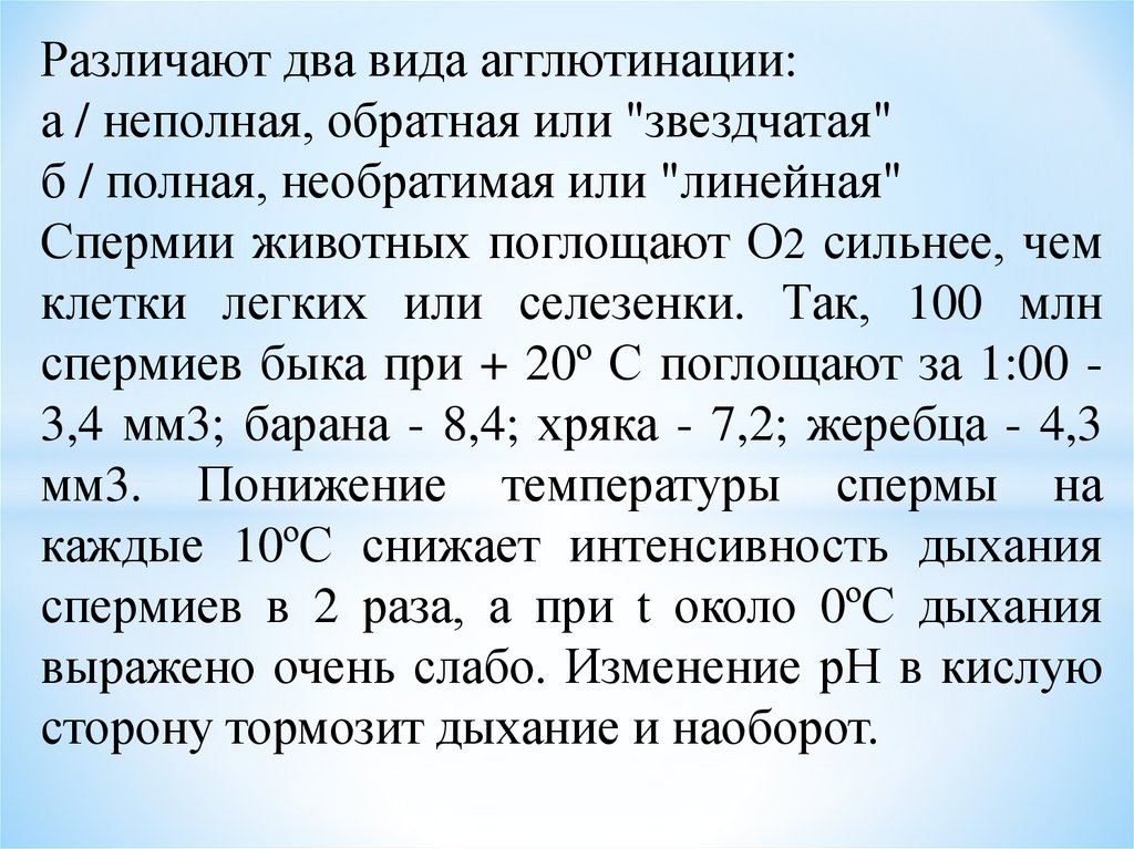 спермиев быка при + 20º С поглощают за 1:00 3,4 мм3; барана - 8,4; хряка - 7,2; жеребца - 4,3
