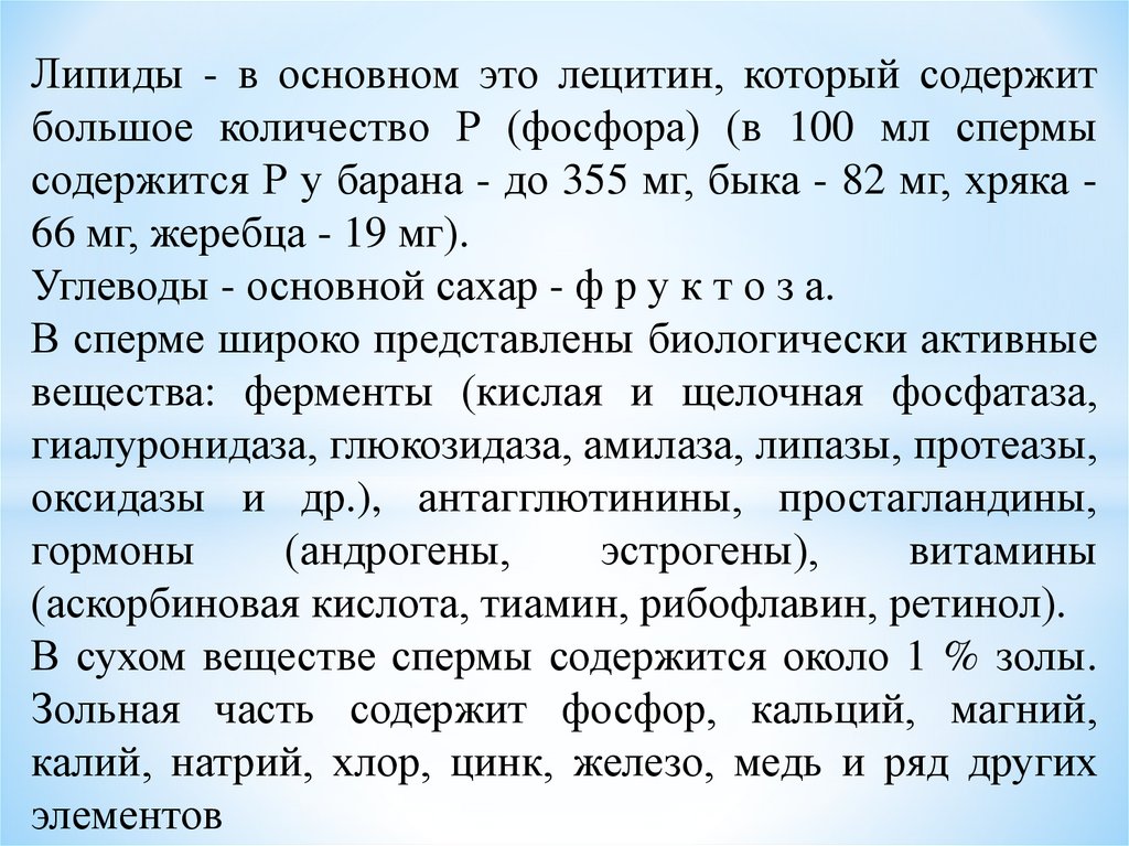 Липиды - в основном это лецитин, который содержитбольшое количество Р (фосфора) (в 100 мл спермы