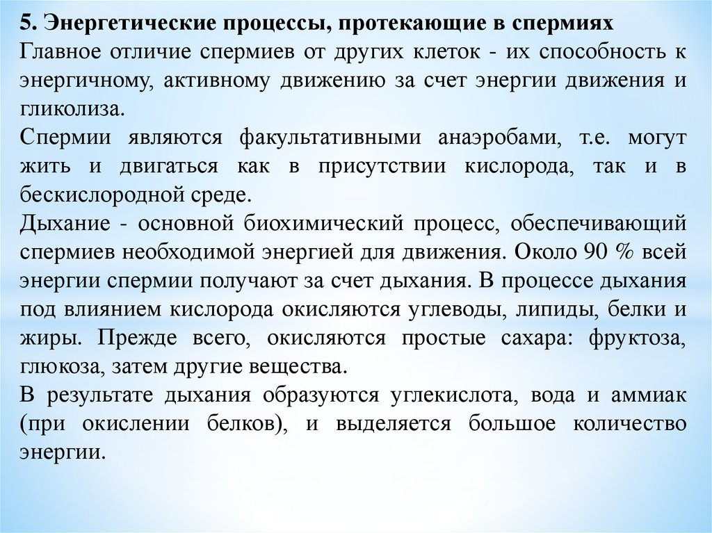 5. Энергетические процессы, протекающие в спермияхГлавное отличие спермиев от других клеток - их способность к