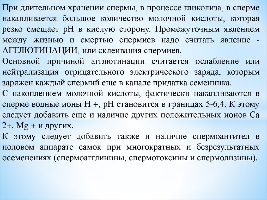 При длительном хранении спермы, в процессе гликолиза, в сперменакапливается большое количество молочной кислоты, которая