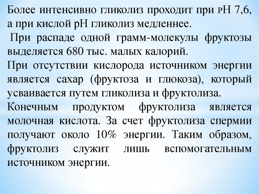 Более интенсивно гликолиз проходит при РН 7,6,а при кислой рН гликолиз медленнее.