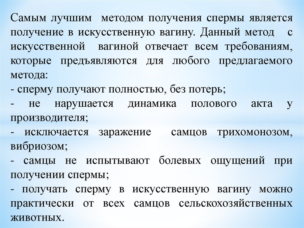 Самым лучшим методом получения спермы являетсяполучение в искусственную вагину. Данный метод с