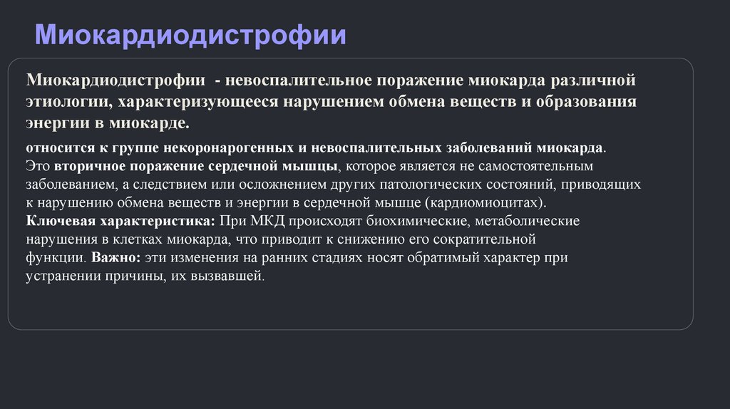 МиокардиодистрофииМиокардиодистрофии - невоспалительное поражение миокарда различной