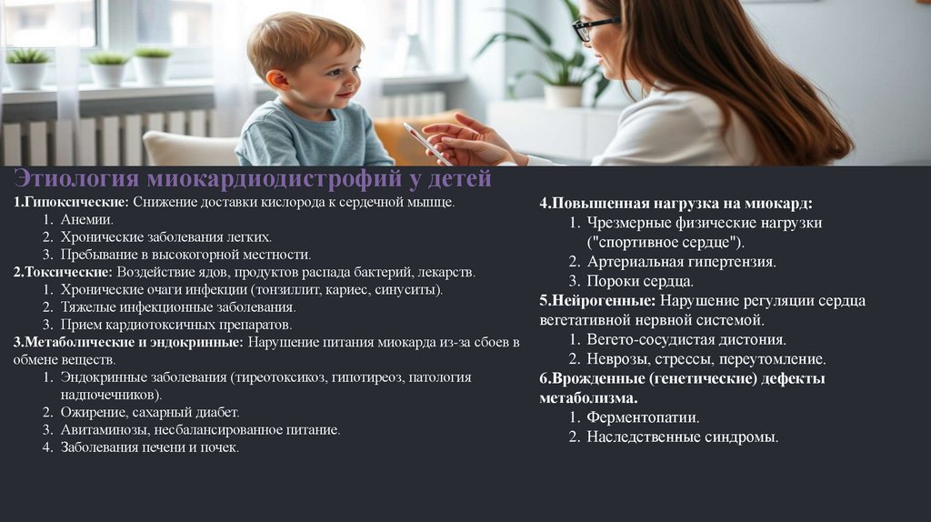 Этиология миокардиодистрофий у детей1.Гипоксические: Снижение доставки кислорода к сердечной мышце.