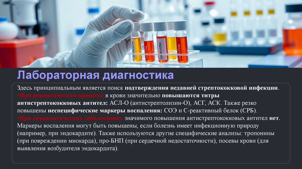 Лабораторная диагностикаЗдесь принципиальным является поиск подтверждения недавней стрептококковой инфекции.
