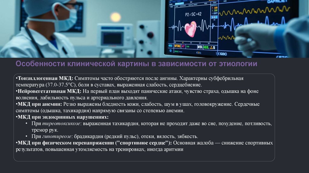 Особенности клинической картины в зависимости от этиологии•Тонзиллогенная МКД: Симптомы часто обостряются после ангины. Характерны субфебрильная