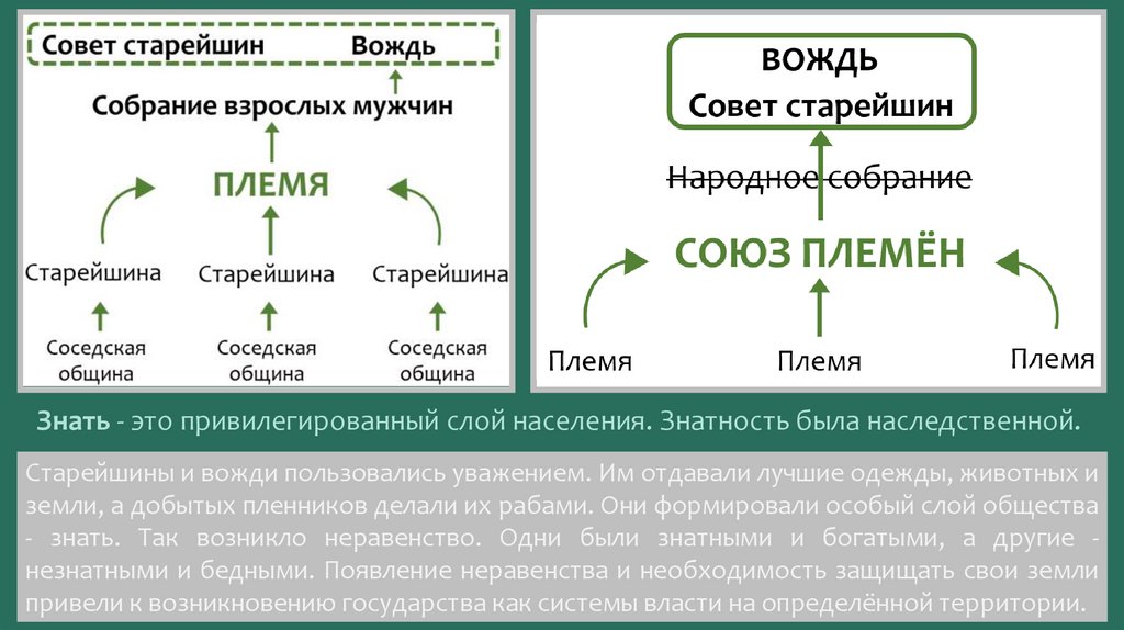 - знать. Так возникло неравенство. Одни были знатными и богатыми, а другие незнатными и бедными. Появление неравенства и необходимость защищать свои земли
