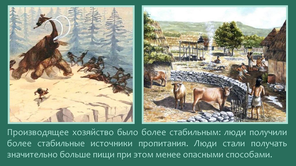 Производящее хозяйство было более стабильным: люди получилиболее стабильные источники пропитания. Люди стали получать