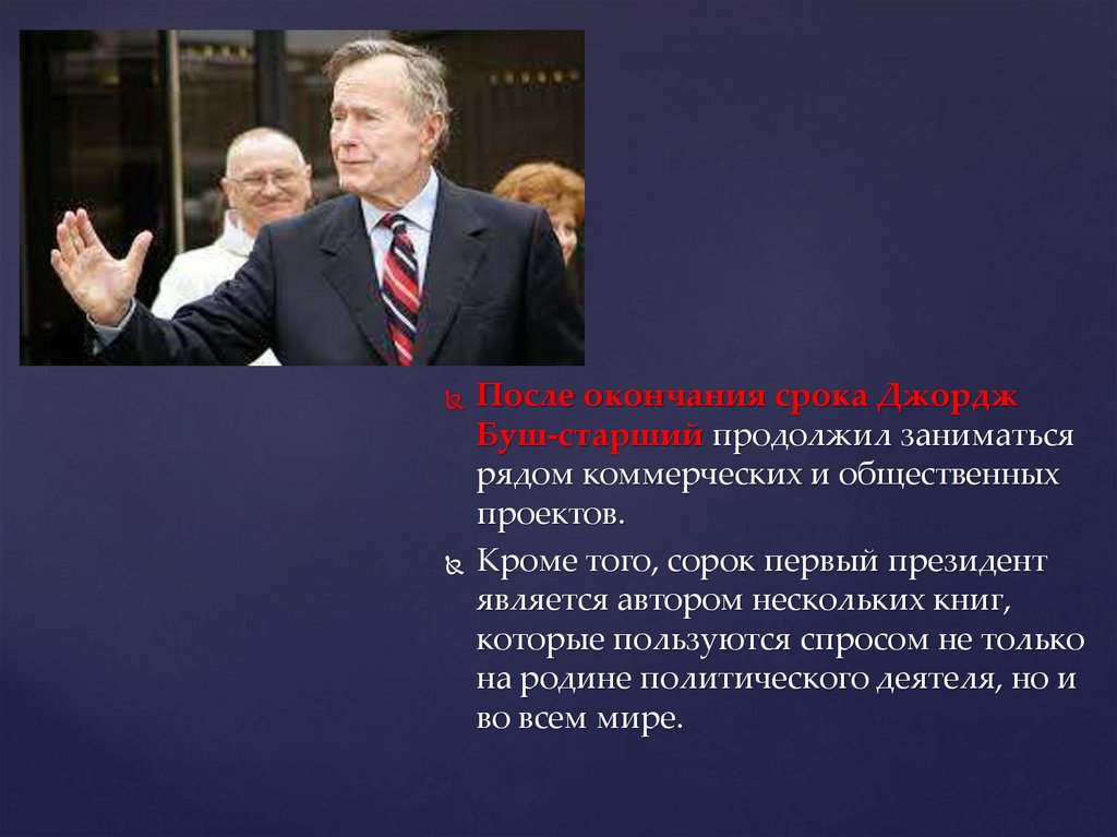 После окончания срока ДжорджБуш-старший продолжил заниматься