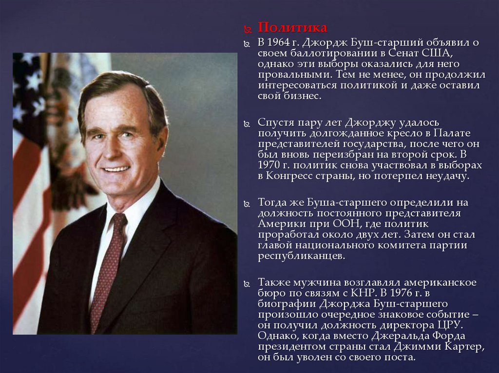 ПолитикаВ 1964 г. Джордж Буш-старший объявил о