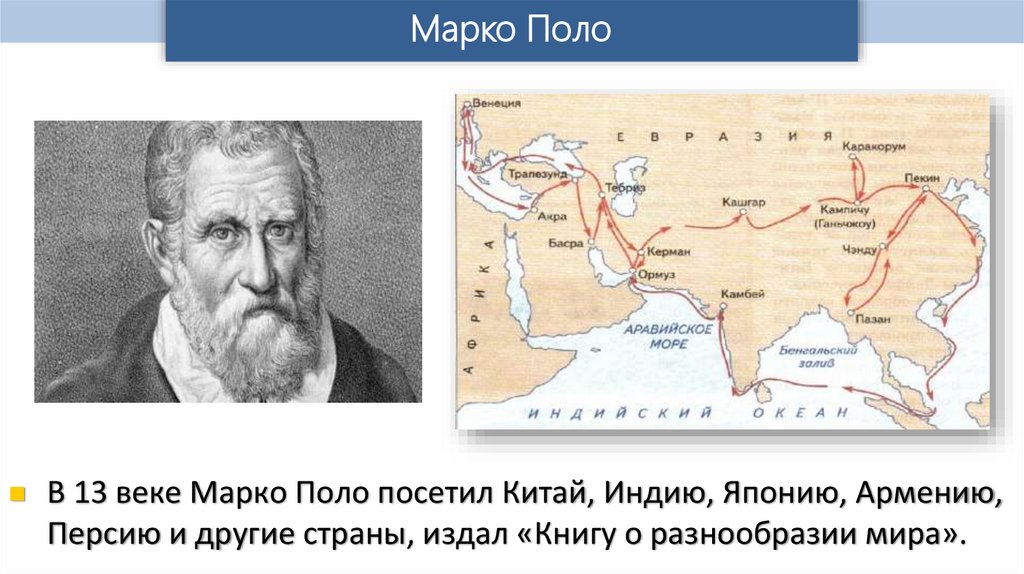 Марко ПолоВ 13 веке Марко Поло посетил Китай, Индию, Японию, Армению,