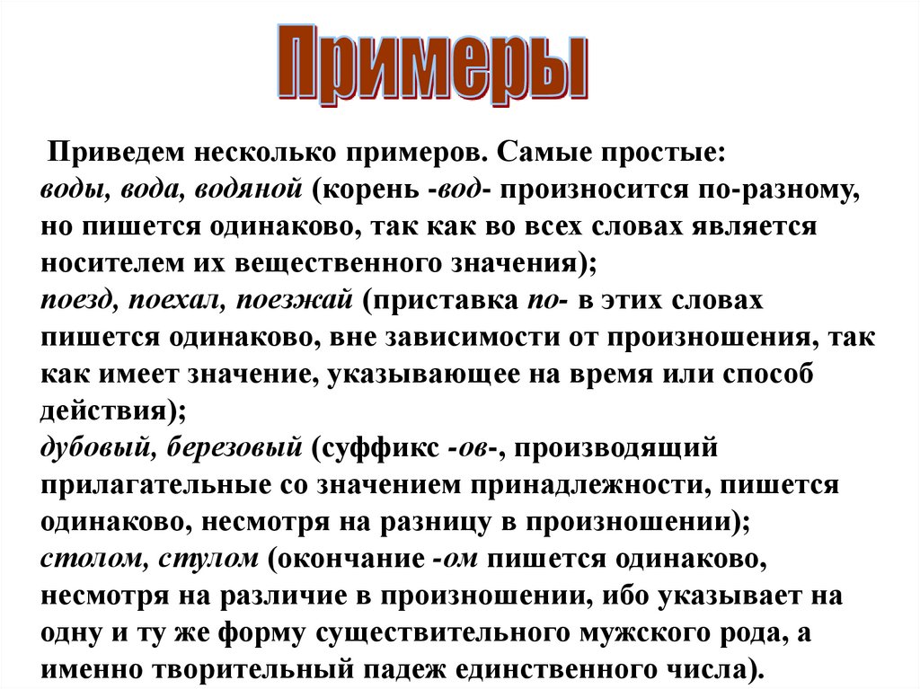Приведем несколько примеров. Самые простые:воды, вода, водяной (корень -вод- произносится по-разному,