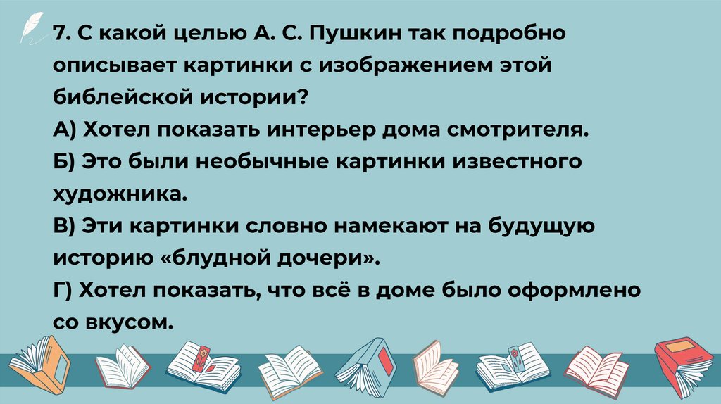 7. С какой целью А. С. Пушкин так подробноописывает картинки с изображением этой