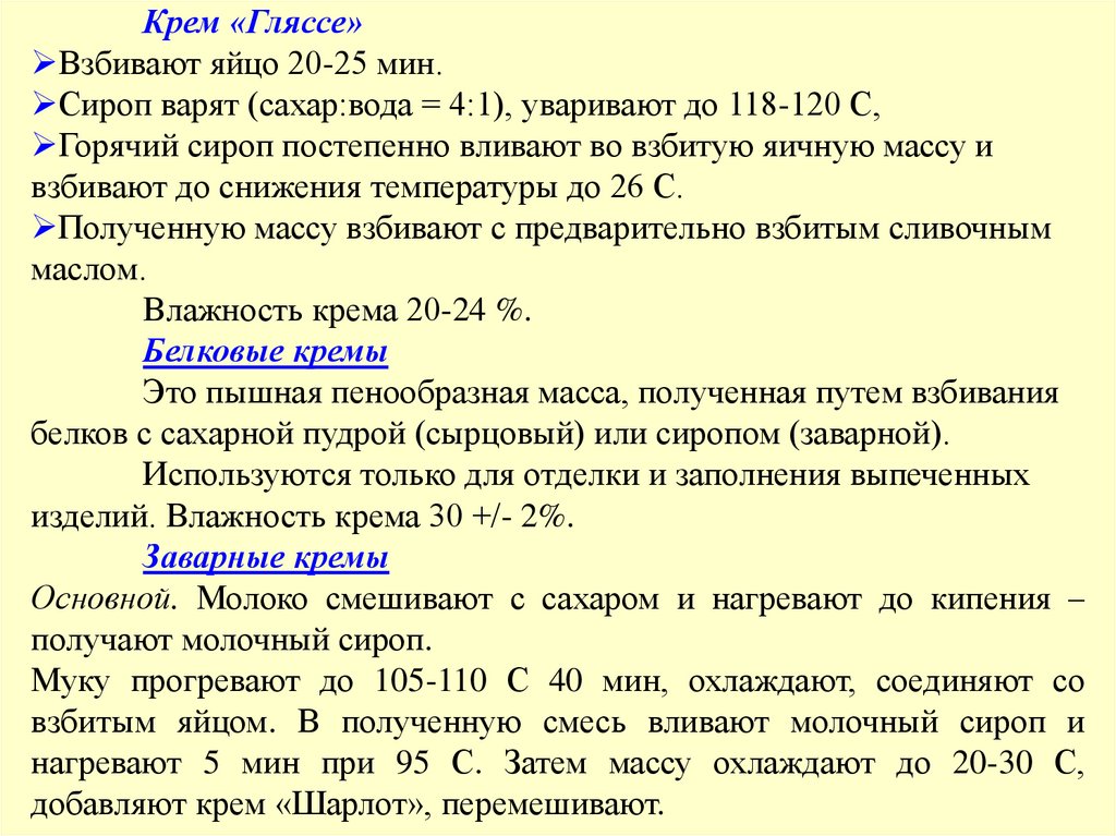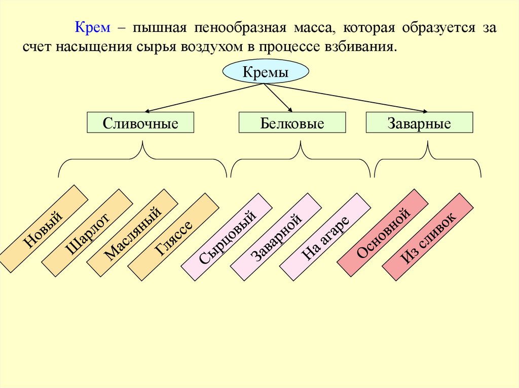 Крем – пышная пенообразная масса, которая образуется засчет насыщения сырья воздухом в процессе взбивания.
