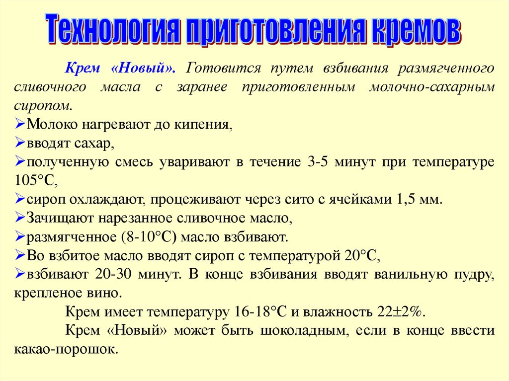 Крем «Новый». Готовится путем взбивания размягченногосливочного масла с заранее приготовленным молочно-сахарным